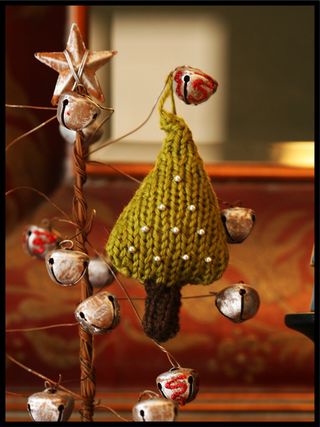 As I browsed through the decor area of one of my favorite stores, I came upon a beautiful little felted Christmas Tree. I fell in love automatically. The tree was made of out felt material just stitched together and decorated with little bells all around. I went home with the idea of the little felted tree. I am terrible with the sewing machine so I kept the idea in the back burner for a future use. Later as I was doing things around the house, it occurred to me that I could just knit myself a little tree of my own. It wouldn’t be sewn like the one I saw but it would still be a little tree. Off to work I went and thus my little ornament was born.