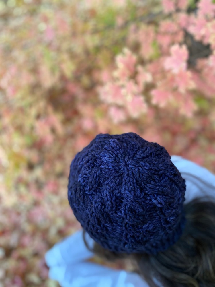 Yarn: Approximately 85 yards of chunky/bulky weight merino wool yarn. Sample was knit with Malabrigo Chunky in Paris Night. Highly recommend a yarn with inherent elasticity to facilitate the reordering of the stitches when creating the cable.