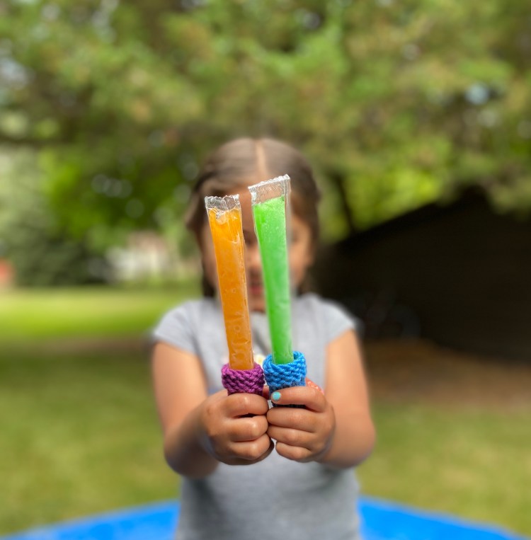 Summer is here and popsicles abound! Keep your little one’s hands from getting cold while holding the popsicle with a little popsicle cozy/sleeve. The cozy knits up super fast, and you can use all those odds and ends of yarn that you may have in the stash.