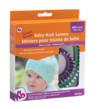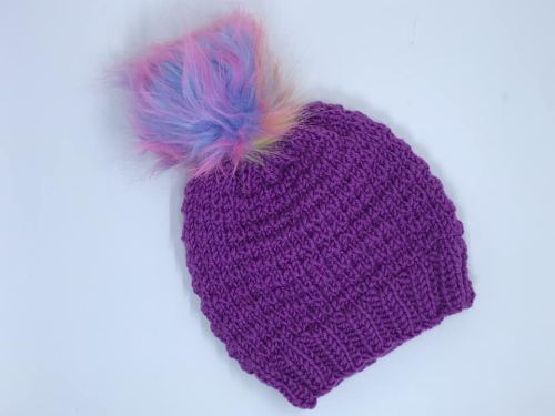 Knitting loom: 64 peg small gauge knitting loom. Sample was knit using purple hat loom from KBLooms Premium set.